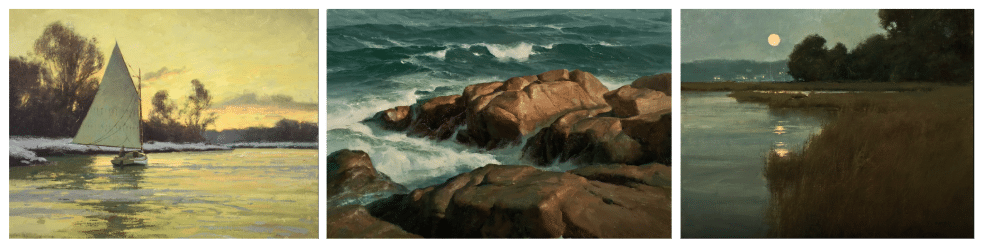 He’s a Fellow of the American Society of Marine Artists, a Signature member of Plein Air Painters of America, and a member of the Guild of Boston Artists and the California Art Club.